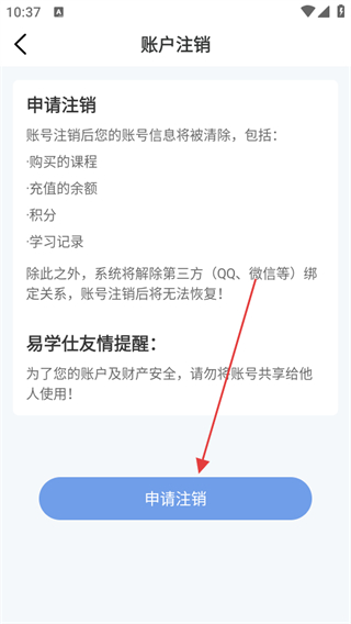 4、在賬戶注銷頁面,點(diǎn)擊申請注銷按鈕,完成賬號注銷操作。