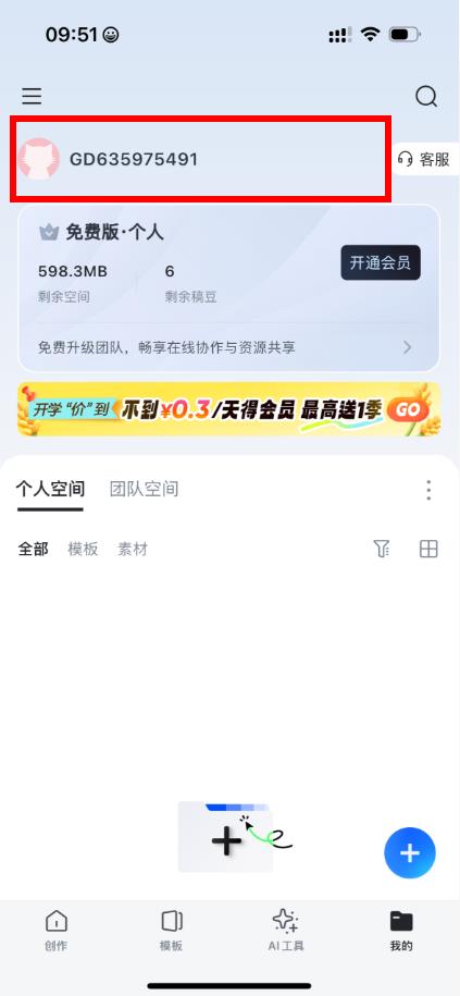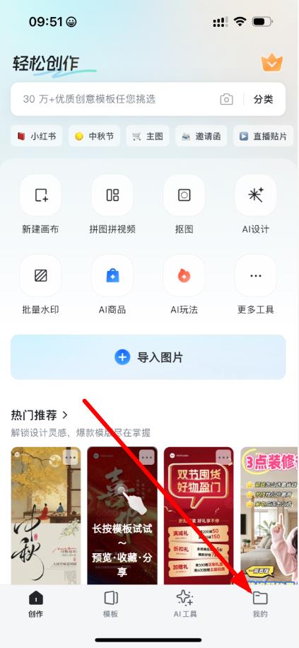 1、打開稿定設(shè)計應(yīng)用,進入輕松創(chuàng)作界面,點擊底部導航欄中的我的。