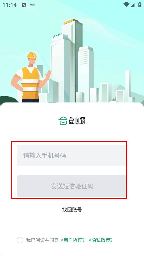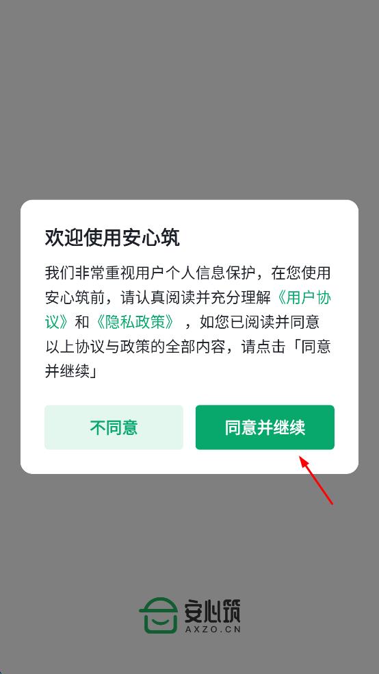 1、打開安心筑應用,在歡迎使用安心筑的提示彈窗中,點擊同意并繼續(xù)按鈕,進入登錄界面。