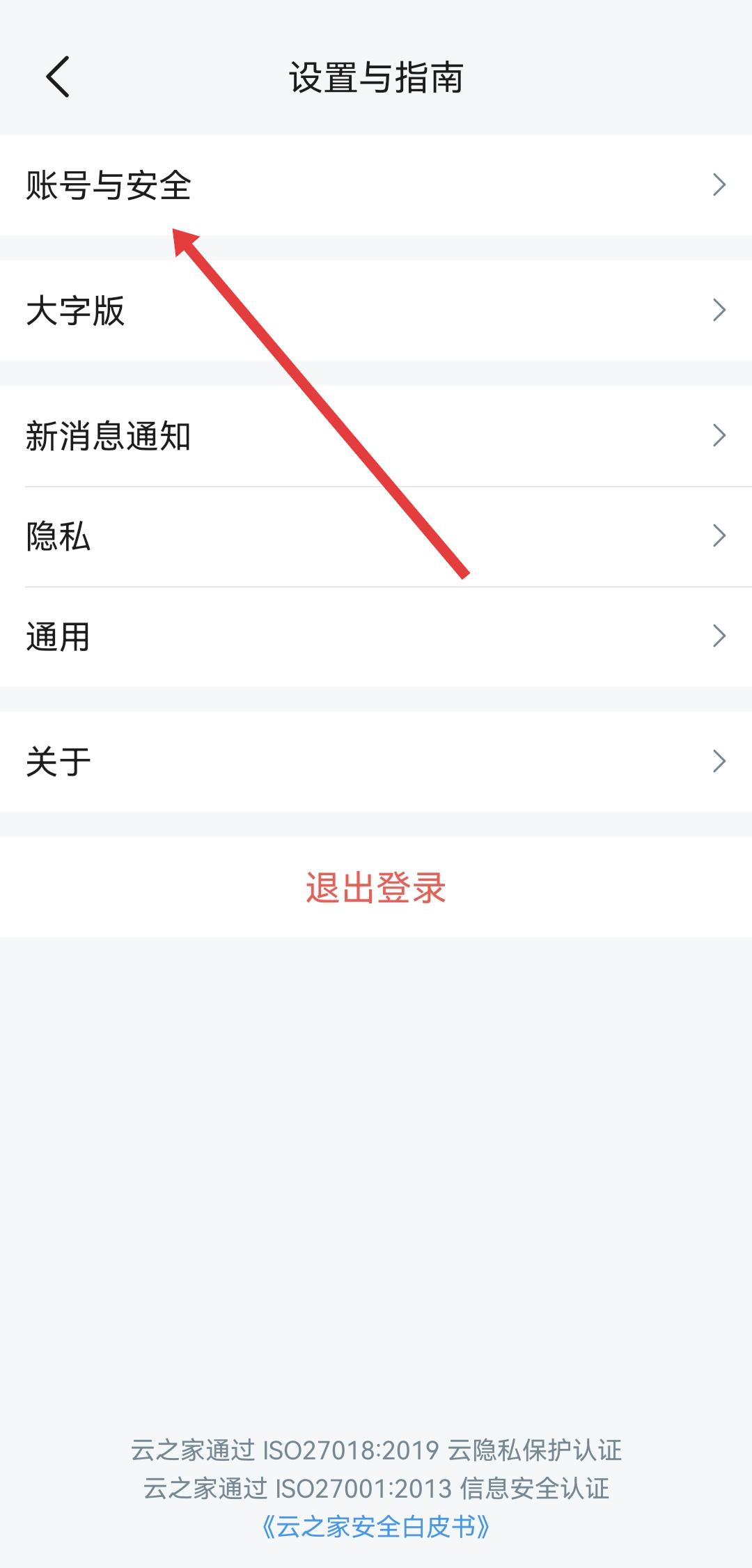 3、在設置與指南頁面,點擊賬號與安全選項,進入賬號與安全設置界面。