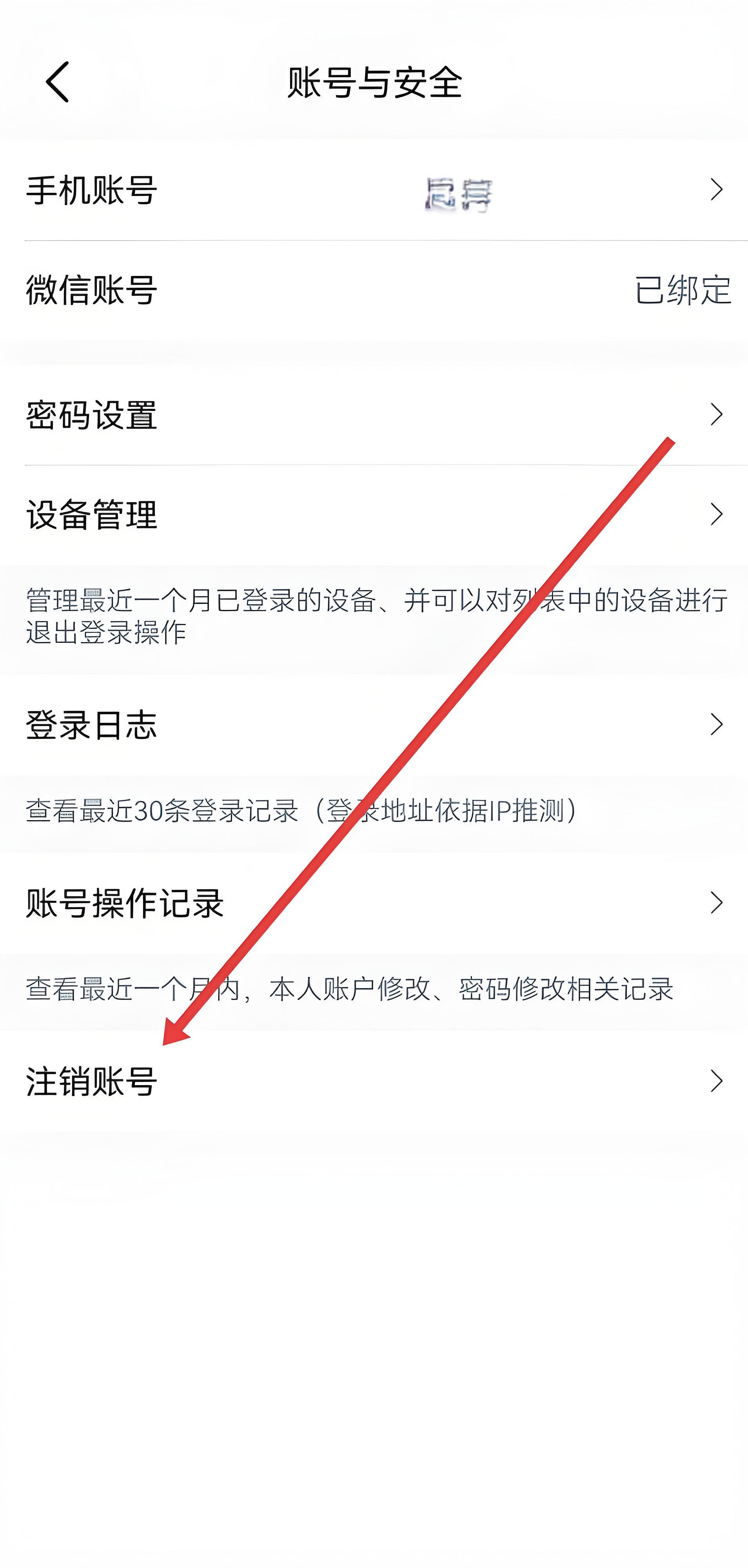 4、在賬號與安全頁面,點擊注銷賬號選項,進入注銷賬號說明頁面。