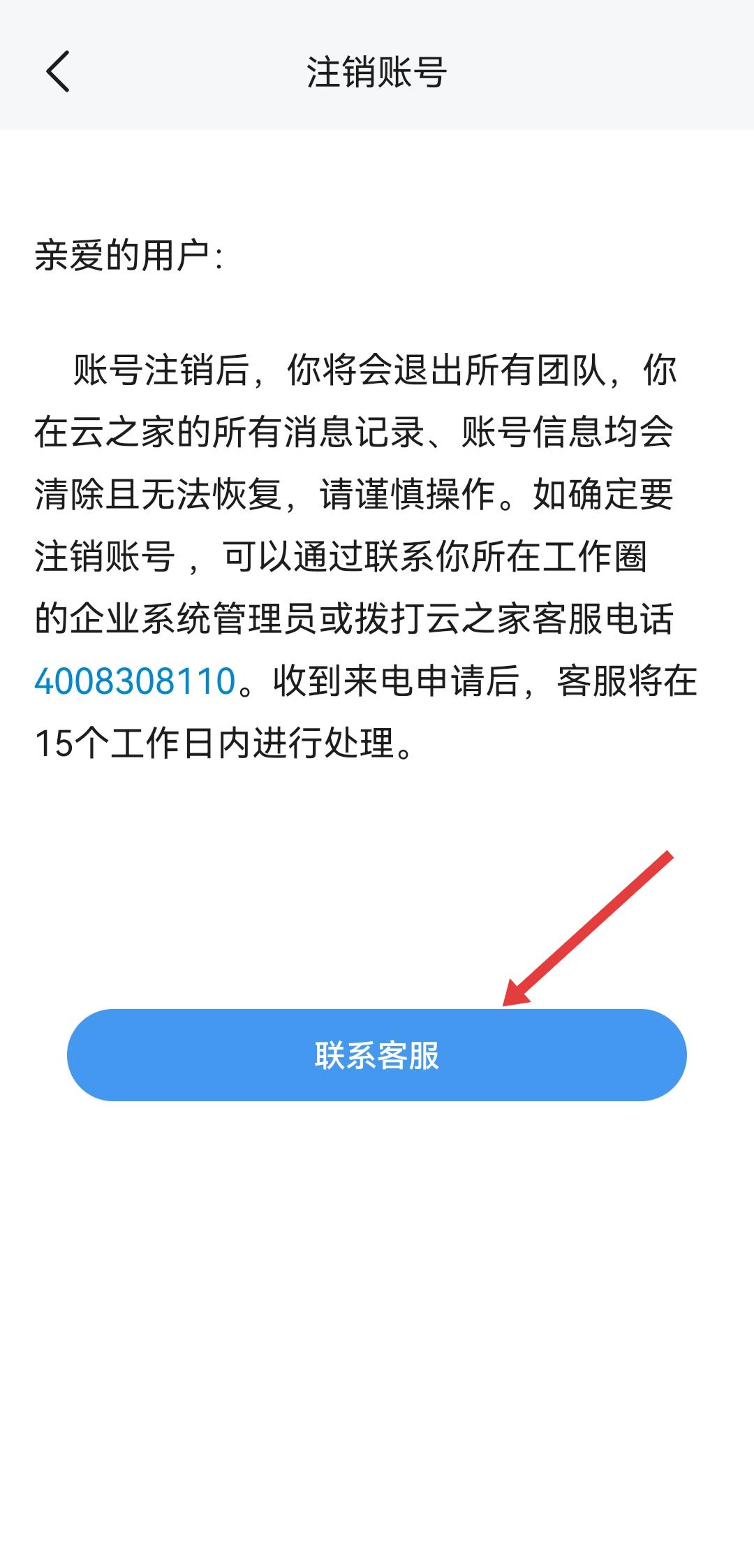 5、在注銷賬號頁面,點擊聯(lián)系客服按鈕,通過協(xié)助在15個工作日內完成賬號注銷。