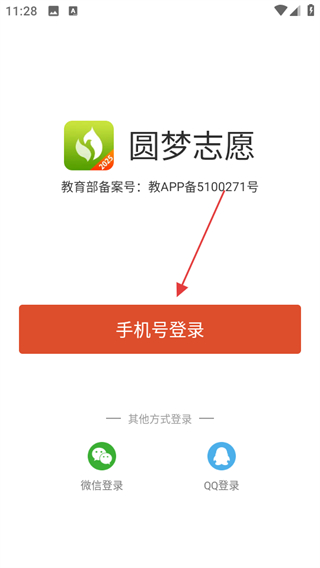 1、打開圓夢志愿APP,在初始界面點(diǎn)擊手機(jī)號登錄按鈕。
