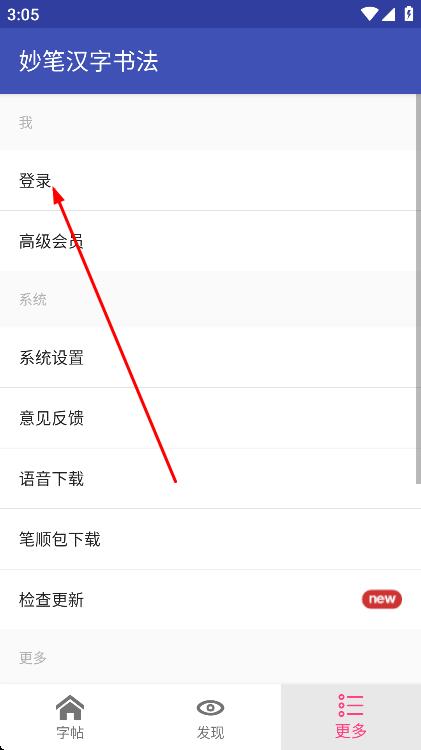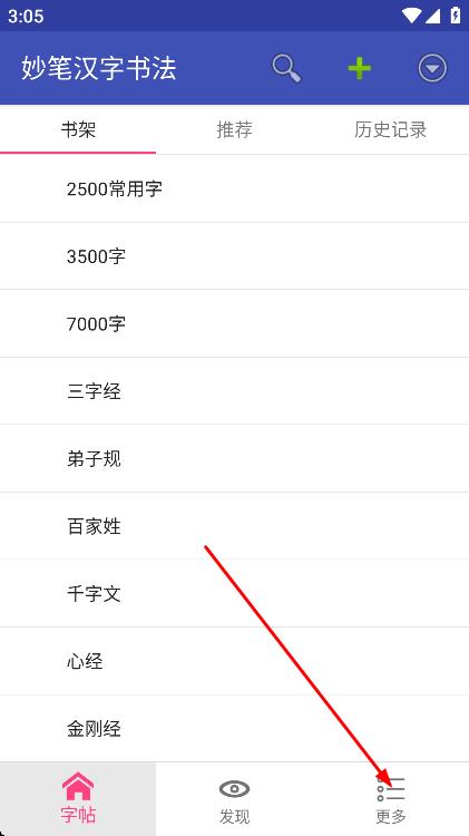 1、打開妙筆漢字書法,點(diǎn)擊底部導(dǎo)航欄中的更多。
