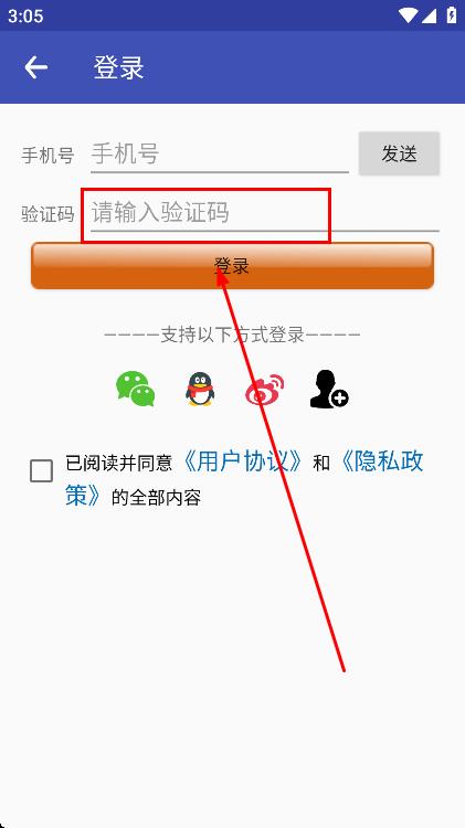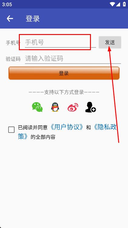 3、輸入需要登錄的手機(jī)號,點(diǎn)擊發(fā)送按鈕獲取驗(yàn)證碼。