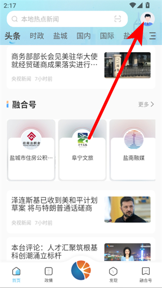 1、打開(kāi)智慧鹽城APP,點(diǎn)擊右上角頭像,進(jìn)入個(gè)人中心頁(yè)面。