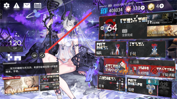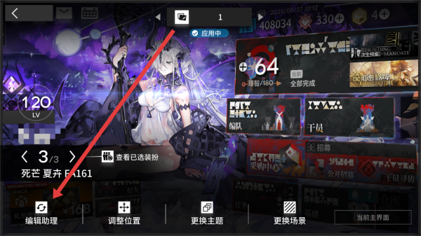 1、在明日方舟主頁(yè)中,可以點(diǎn)擊箭頭指向按鈕,進(jìn)行編輯主頁(yè)。