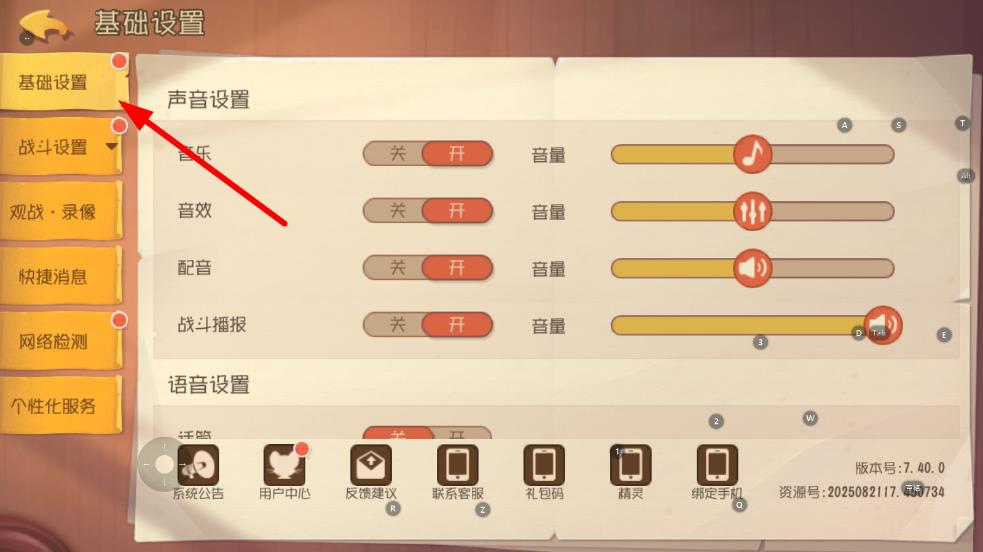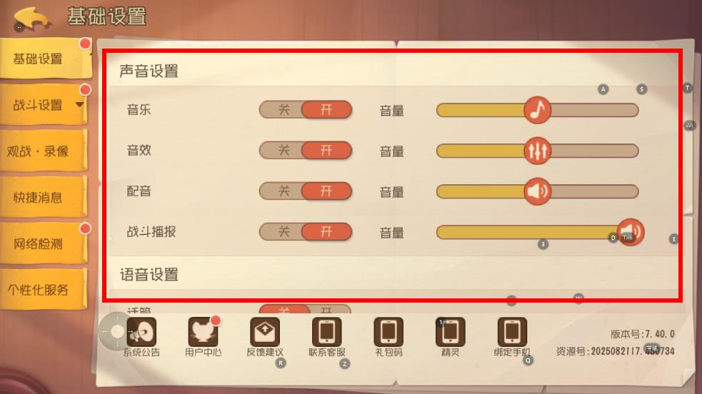 3、在基礎設置頁面的聲音設置板塊,找到音樂、音效、配音、戰(zhàn)斗播報選項,點擊對應選項的開關按鈕,將其狀態(tài)切換為關,即可關閉相應的游戲聲音。