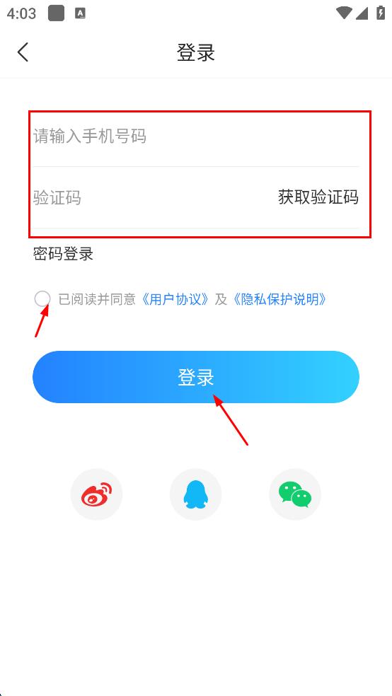 4、在登錄界面,輸入手機號碼,點擊“獲取驗證碼”,將收到的驗證碼填入,勾選已閱讀并同意相關(guān)協(xié)議,點擊“登錄”按鈕完成登錄。