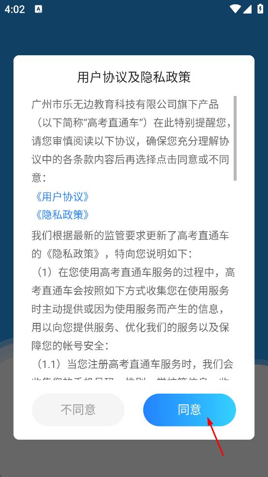 1、打開高考直通車APP,彈出用戶協(xié)議及隱私政策窗口,閱讀后點擊“同意”按鈕,進入APP主界面。