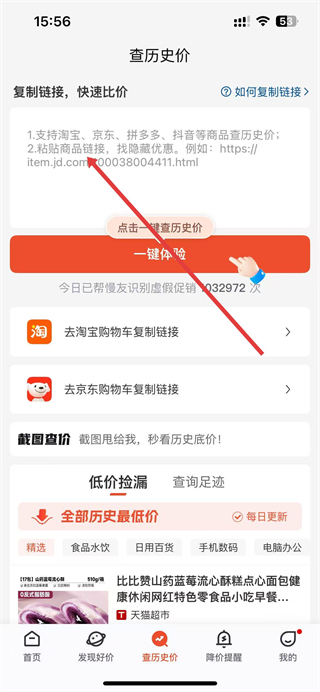 2、在查歷史價頁面的輸入框中,粘貼要查詢商品的鏈接,支持淘寶、京東等平臺商品鏈接。