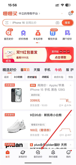 1、打開慢慢買app,點擊底部導航欄中的查歷史價選項,進入查歷史價頁面。