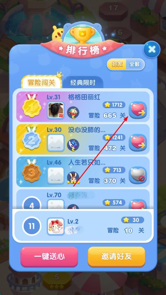 2、在排行榜界面中,能看到好友的游戲信息,找到想要贈(zèng)送愛(ài)心的好友,點(diǎn)擊其信息右側(cè)的愛(ài)心圖標(biāo)。