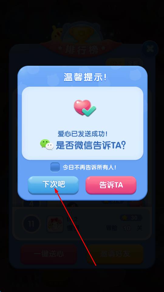 3、點(diǎn)擊后會(huì)彈出提示框,顯示愛(ài)心已發(fā)送成功,點(diǎn)擊下次吧即可完成送心操作。