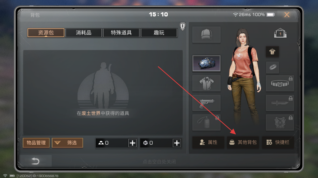 2、在打開的背包界面中,點(diǎn)擊右下方的其他背包選項(xiàng),查看更多背包存儲(chǔ)的物品。