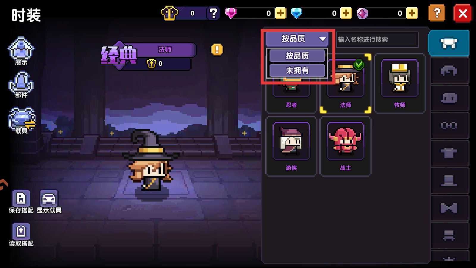2、在時裝界面中,點擊右上方下拉菜單,可以選擇篩選方式,方便查看還未獲取的時裝。