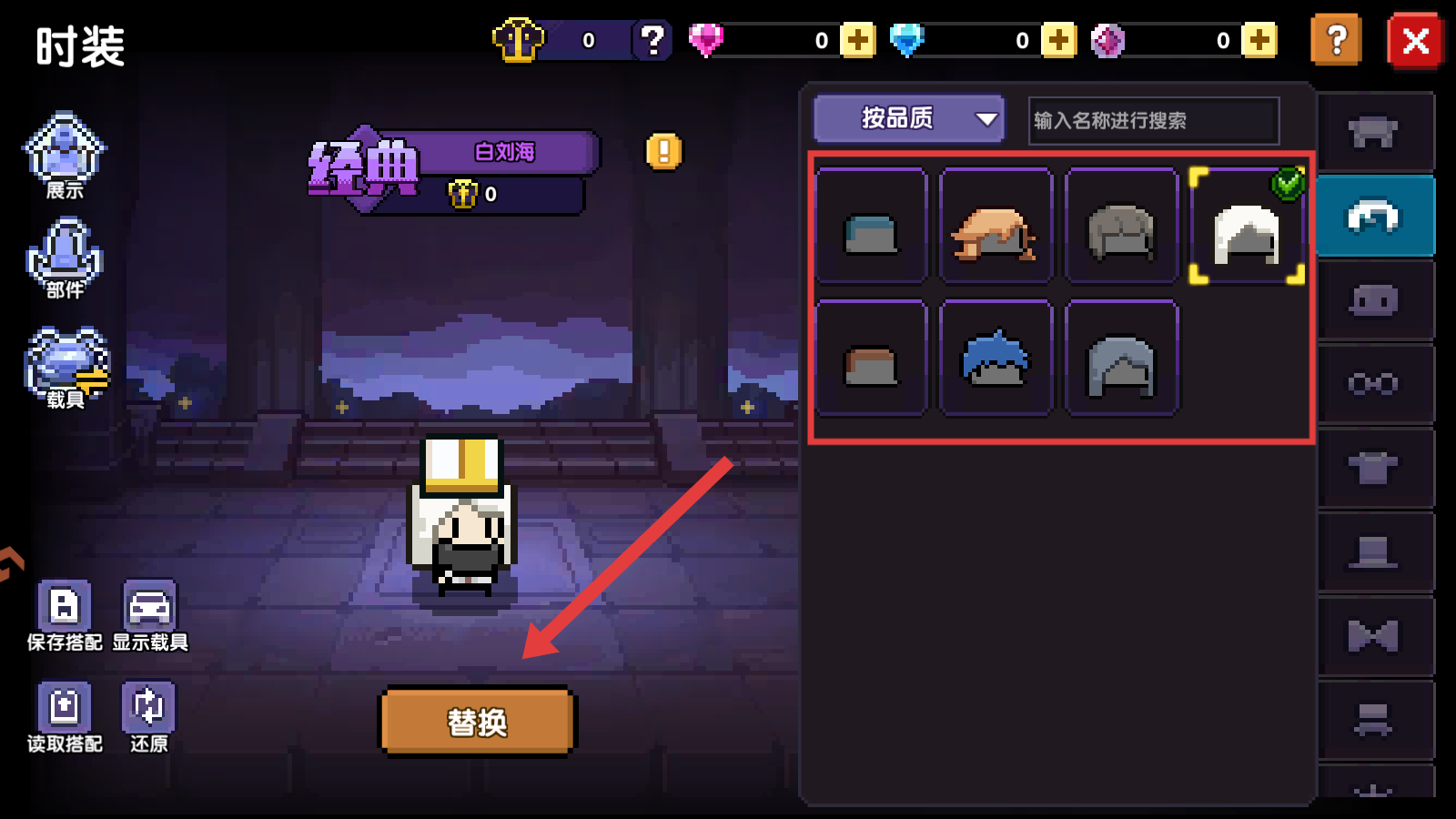 3、選中想要更換的時裝部件,點擊該時裝部件,此時角色會預覽穿上該時裝部件的效果,確認后點擊下方的替換按鈕,即可成功更換該時裝部件。