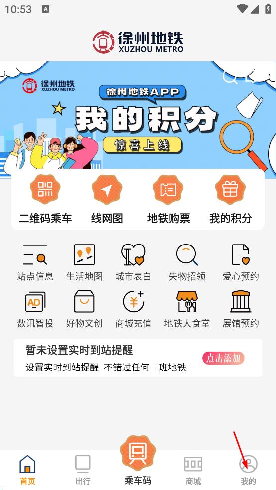 1、打開徐州地鐵軟件,進(jìn)入首頁(yè)后,點(diǎn)擊頁(yè)面右下角的“我的”選項(xiàng)。