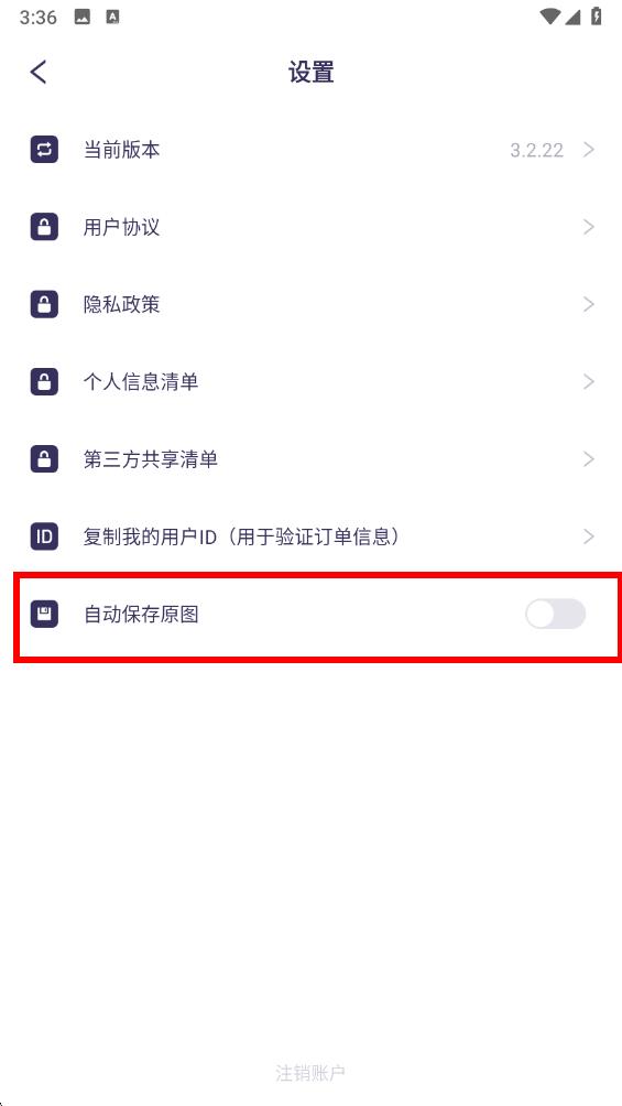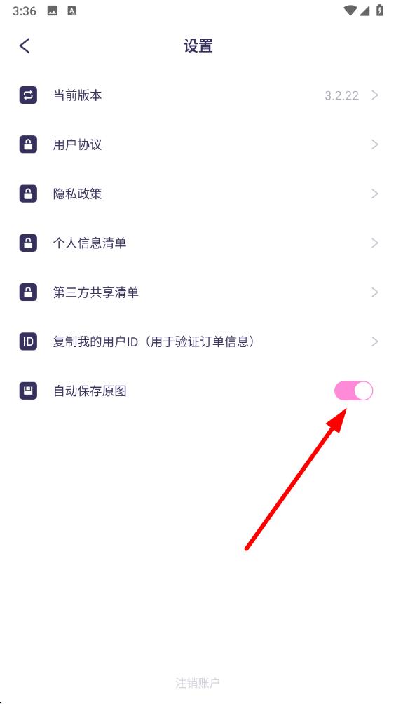 4、點擊自動保存原圖右側(cè)的開關(guān)按鈕,將其開啟,這樣就成功設(shè)置了自動保存。