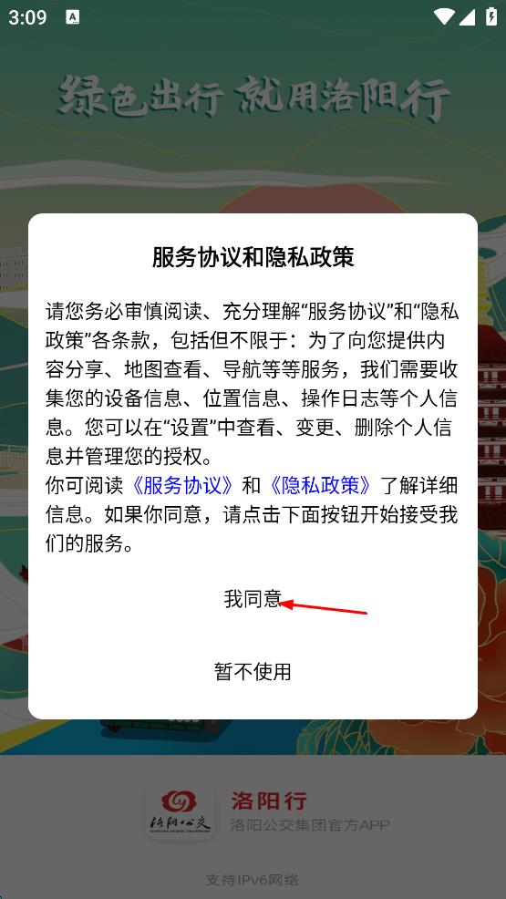 1、打開(kāi)洛陽(yáng)行App,出現(xiàn)服務(wù)協(xié)議和隱私政策彈窗,閱讀后點(diǎn)擊我同意按鈕。