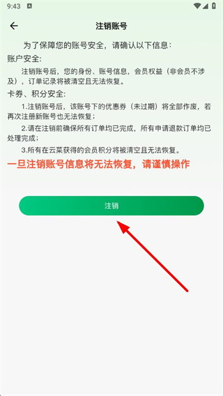 5、在注銷賬號確認頁面,仔細閱讀相關(guān)提示信息后,點擊注銷按鈕,完成賬號注銷。