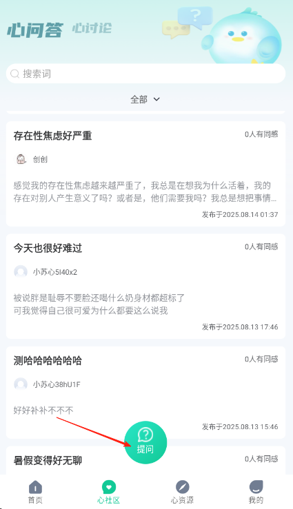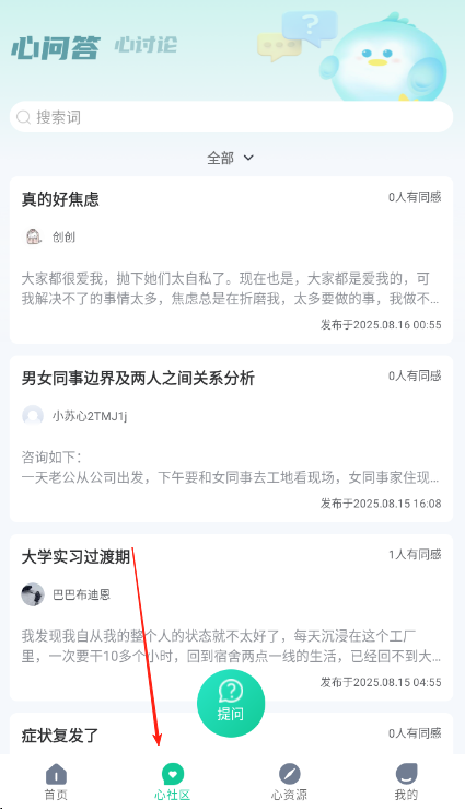 1、開(kāi)啟APP進(jìn)入心社區(qū)頁(yè)面,瀏覽用戶發(fā)布的各類心理相關(guān)帖子,如焦慮情緒分享等,點(diǎn)擊感興趣內(nèi)容查看詳情,也可通過(guò)提問(wèn)按鈕發(fā)布自身心理疑惑。