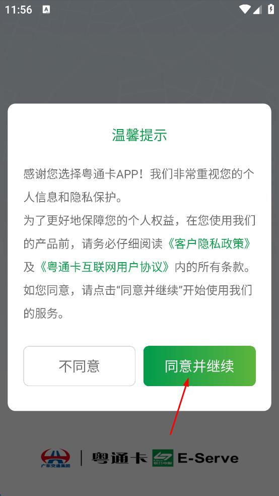 1、打開粵通卡APP,會彈出溫馨提示頁面,仔細閱讀后點擊同意并繼續(xù)按鈕。