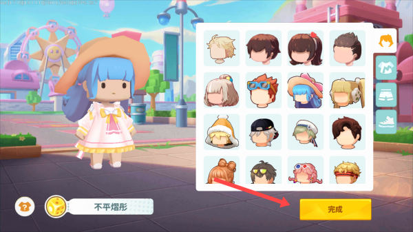 1、在角色定制頁,點(diǎn)選右側(cè)發(fā)型服飾鞋子等分類,搭配喜歡外觀,確認(rèn)后點(diǎn)完成保存?zhèn)€性化角色形象。