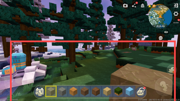 3、進(jìn)入游戲,可采集方塊、建造探索,靠近樹木石塊長按采集方塊,拖放道具欄方塊建造,探索地圖解鎖內(nèi)容。