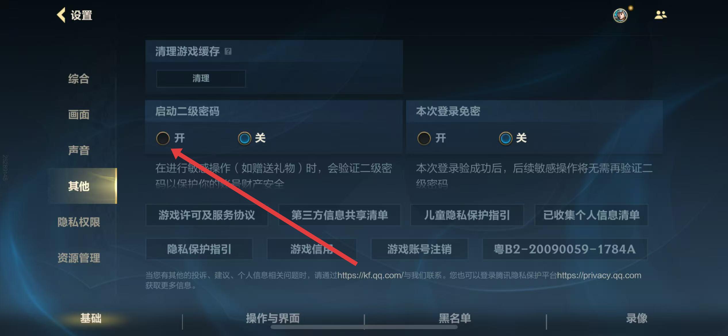 4、在其他設置頁面,找到啟動二級密碼選項,點擊開,按照后續(xù)提示完成二級密碼的設置操作。
