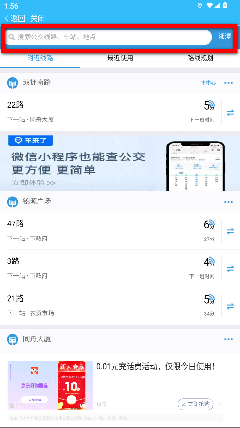 2、在公交查詢頁(yè)面的搜索框,輸入要查詢的公交線路、車站或地點(diǎn)。