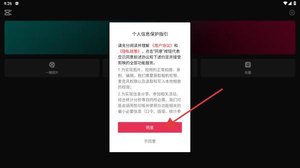 1、打開剪映APP,進(jìn)入時(shí)會(huì)彈出個(gè)人信息保護(hù)指引,點(diǎn)擊同意的按鈕。