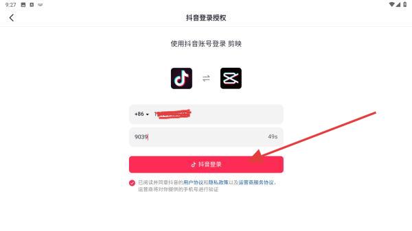 4、在抖音登錄授權(quán)的界面下,輸入要登錄的手機(jī)號(hào)、驗(yàn)證碼,再點(diǎn)擊抖音登錄即可完成。