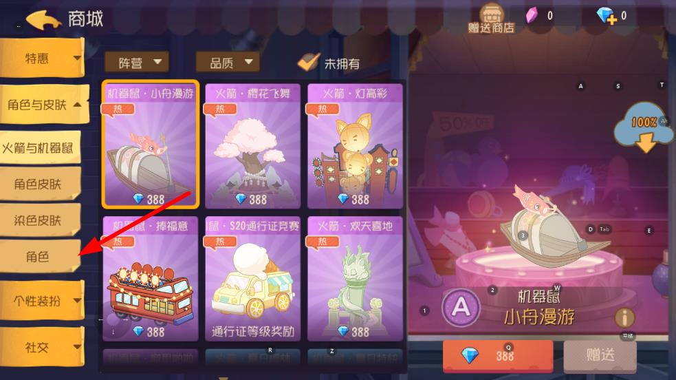 2、進入商城界面后,點擊左側(cè)列表中的角色選項,此時頁面會展示出各種可供購買的游戲角色,不同角色下方標(biāo)注了對應(yīng)的價格。