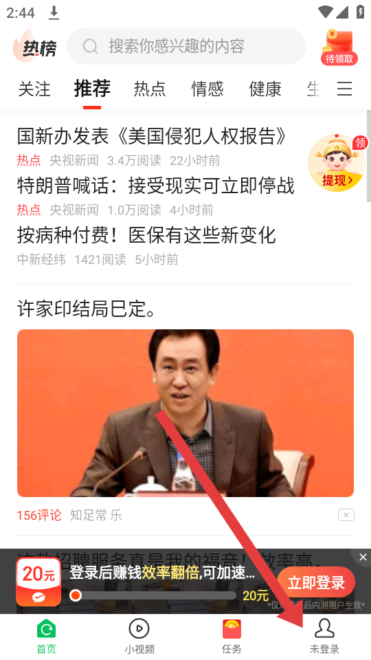1、打開中青看點極速版APP,在首頁底部導(dǎo)航欄找到未登錄按鈕并點擊,進入個人中心頁面,此為開啟邀請碼填寫流程的第一步操作。