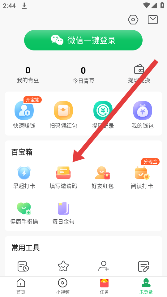 2、進入個人中心后,在百寶箱功能區(qū)中,點擊標有填寫邀請碼的圖標,進入邀請碼填寫專屬界面,為后續(xù)錄入邀請碼做準備。
