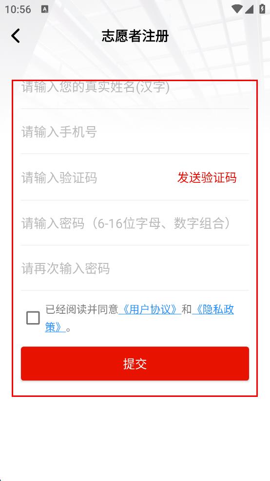 4、在志愿者注冊頁面,依次輸入真實(shí)姓名、手機(jī)號、驗(yàn)證碼、密碼并再次確認(rèn)密碼,勾選同意相關(guān)協(xié)議后,點(diǎn)擊提交按鈕。