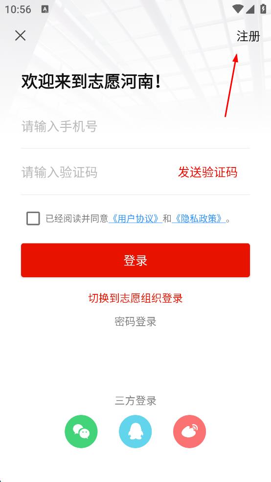3、在登錄頁面,點(diǎn)擊右上角注冊選項(xiàng),進(jìn)入志愿者注冊頁面。