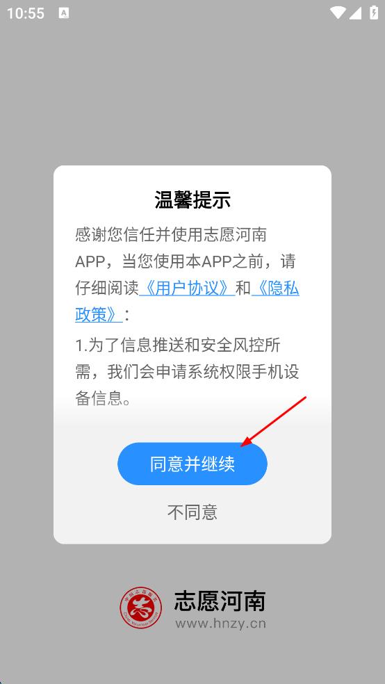 1、打開志愿河南App,在溫馨提示彈窗中,點(diǎn)擊同意并繼續(xù)按鈕,進(jìn)入首頁。