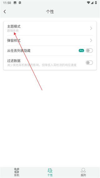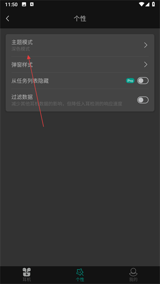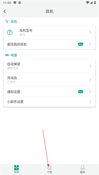 1、打開PodsTool應(yīng)用,在耳機頁面點擊底部的個性選項,進(jìn)入個性設(shè)置界面。