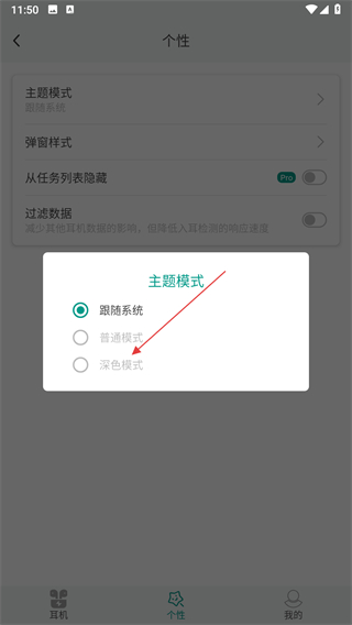 2、在個性設(shè)置界面,點擊主題模式選項,彈出主題模式選擇窗口。