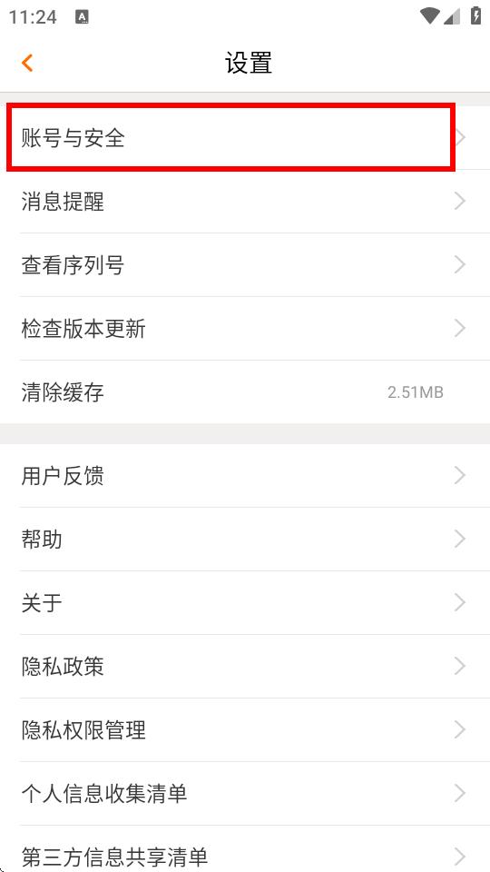 3、在設(shè)置頁面里,點(diǎn)擊賬號與安全選項(xiàng),進(jìn)入賬號安全相關(guān)界面。