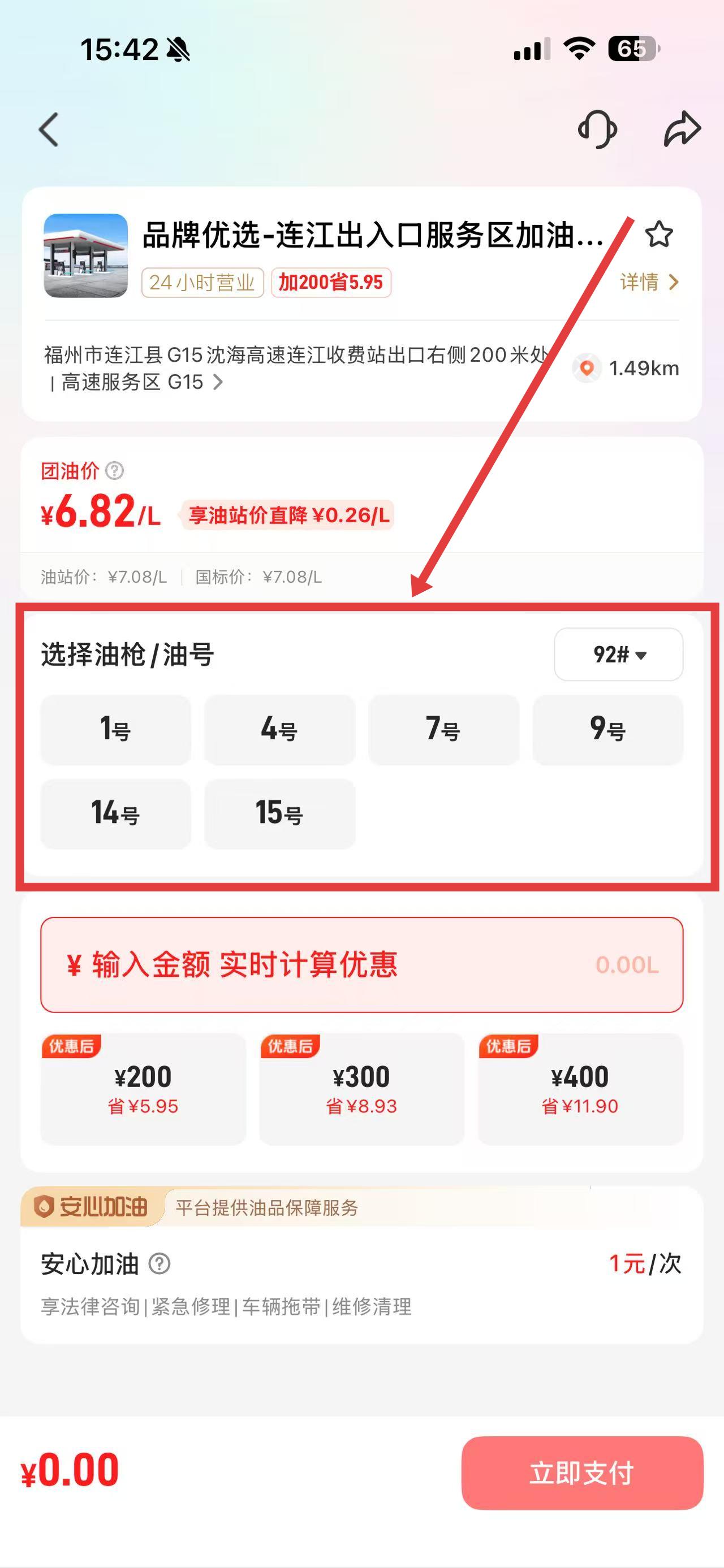 2、進(jìn)入加油站頁面,選油槍號和汽油型號如92號汽油。