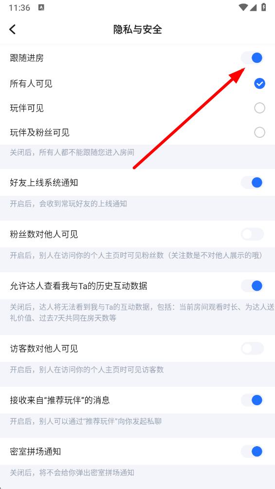 4、進(jìn)入隱私與安全頁(yè)面后,找到跟隨進(jìn)房選項(xiàng),點(diǎn)擊其右側(cè)的開(kāi)關(guān)按鈕,將其關(guān)閉即可。