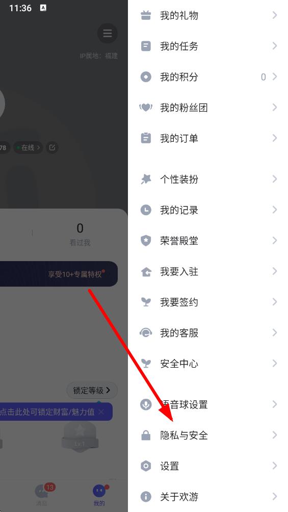 3、在彈出的側(cè)邊欄菜單中,點(diǎn)擊隱私與安全的選項(xiàng)。