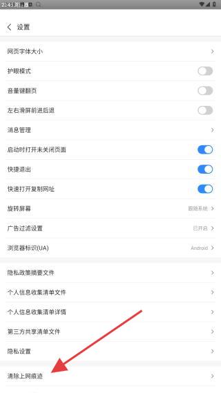 3、進(jìn)入設(shè)置頁(yè)面,向下滑動(dòng)找到并點(diǎn)擊清除上網(wǎng)痕跡的功能按鈕。
