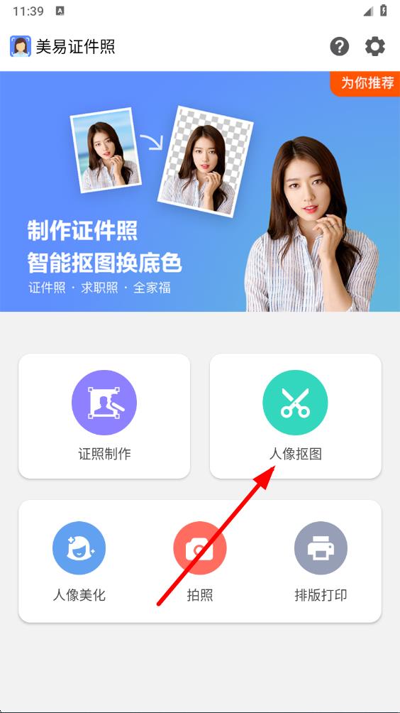 1、打開美易證件照app,在主界面點擊人像摳圖選項,進(jìn)入圖片選擇界面。
