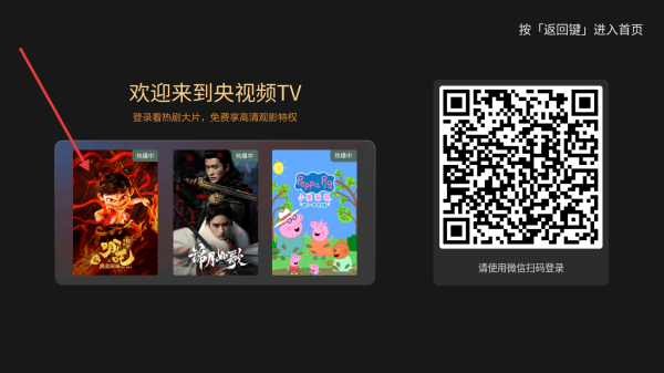 1、畫面顯示歡迎的標(biāo)題語,可掃碼進(jìn)行登錄也可直接點(diǎn)擊下列三個(gè)影視進(jìn)行觀看,點(diǎn)擊返回鍵進(jìn)入到首頁。