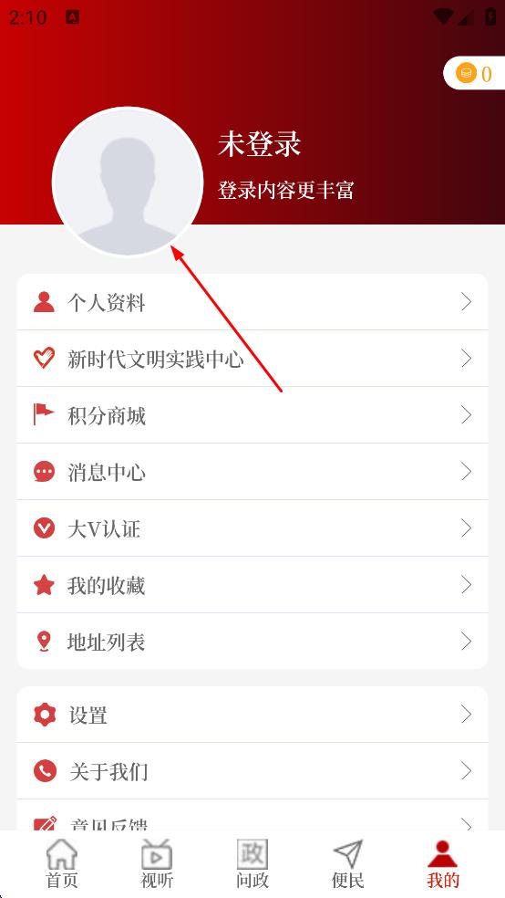 2、在“我的”頁(yè)面,點(diǎn)擊頭像區(qū)域,進(jìn)入登錄頁(yè)面。