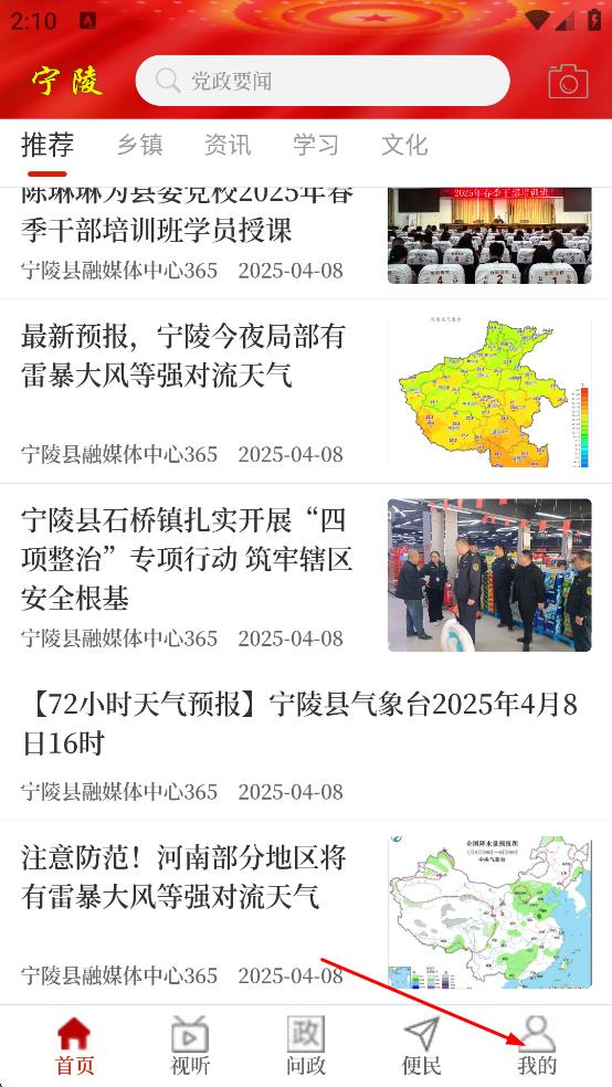 1、打開寧陵融媒體APP,進(jìn)入首頁(yè)后,點(diǎn)擊頁(yè)面右下角的“我的”按鈕。